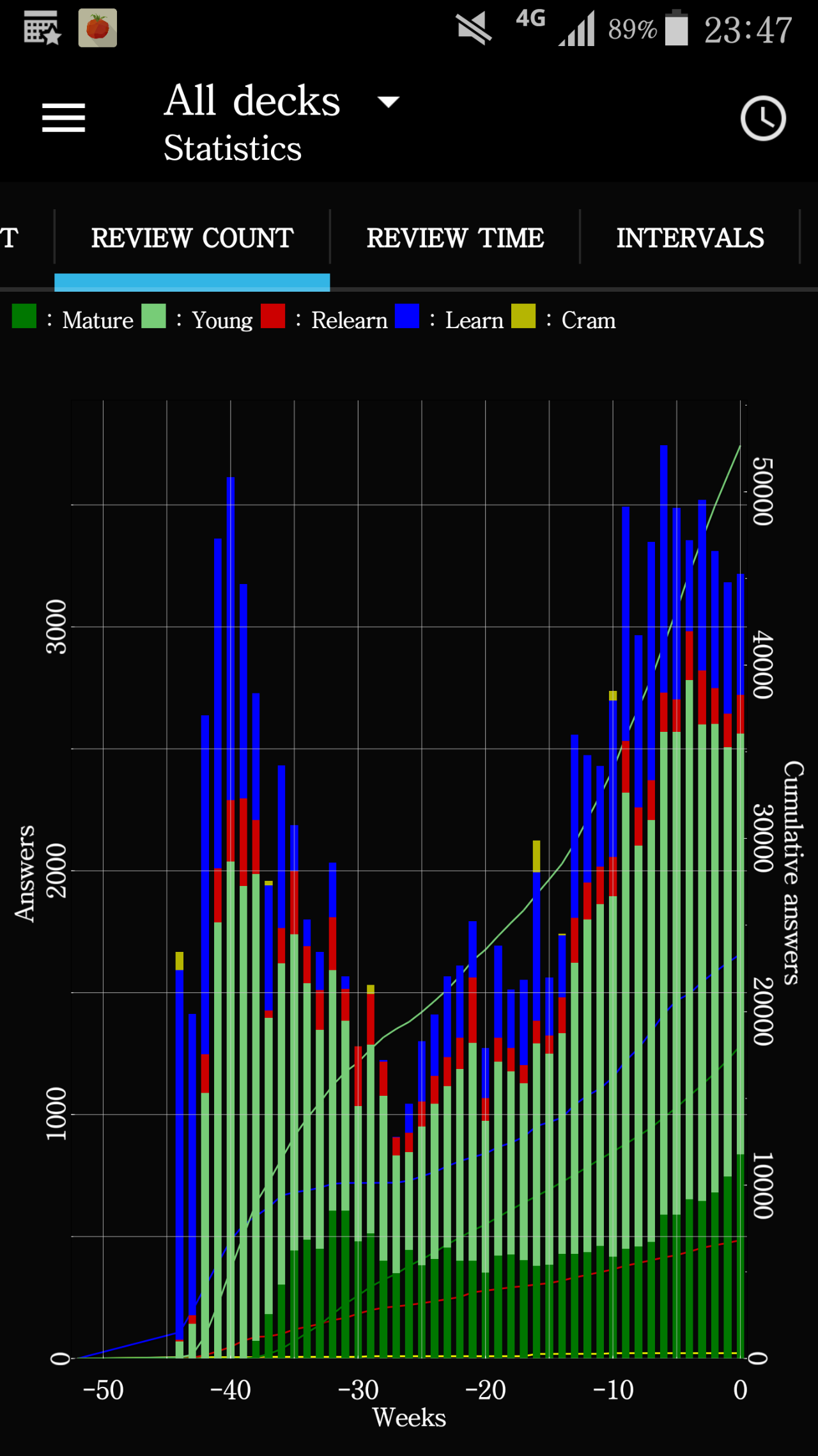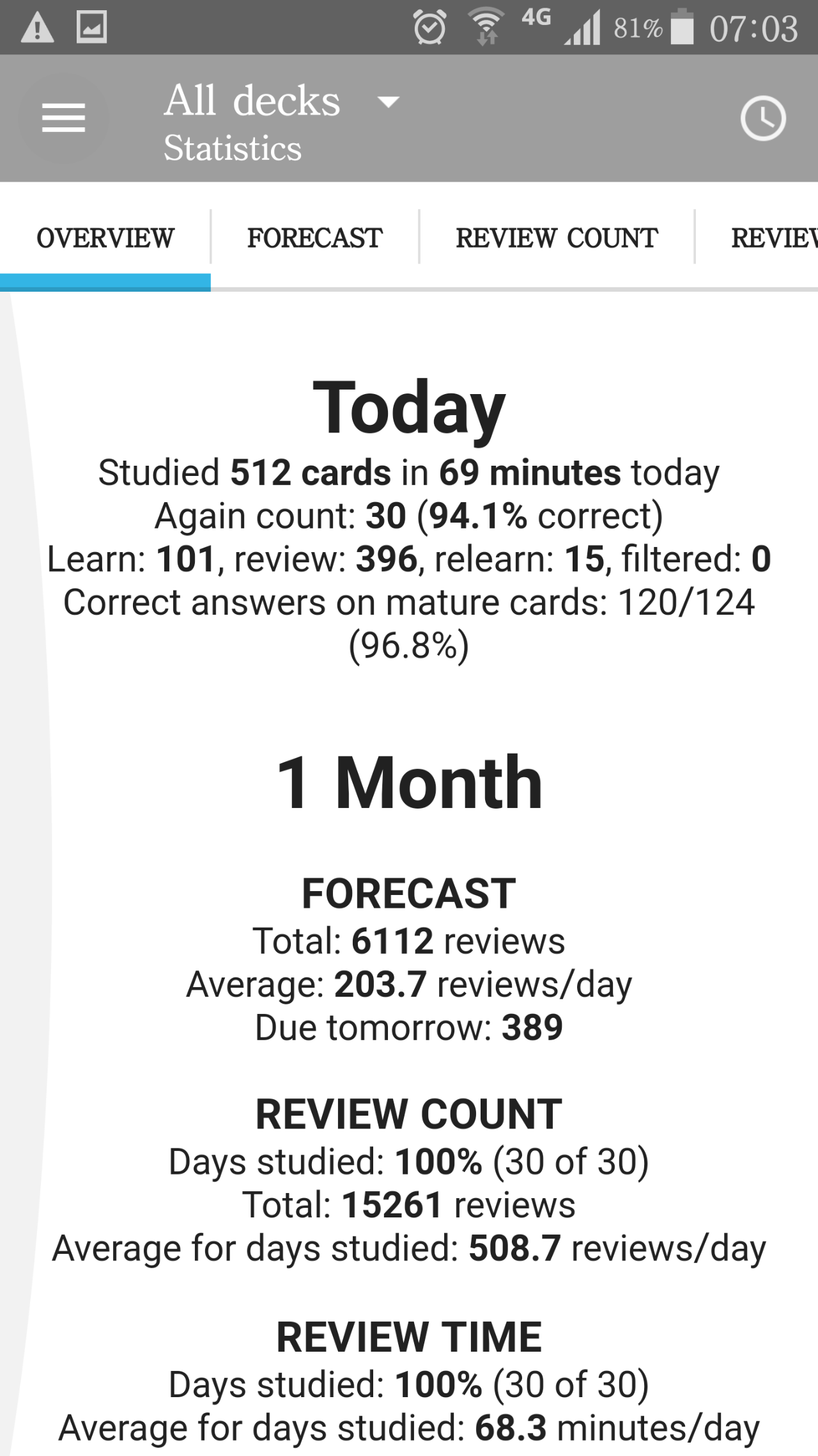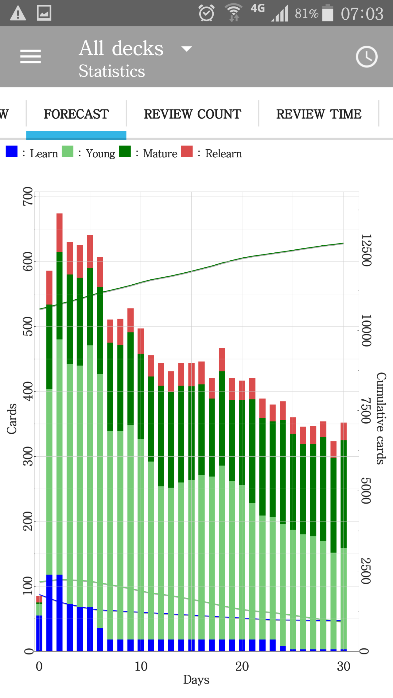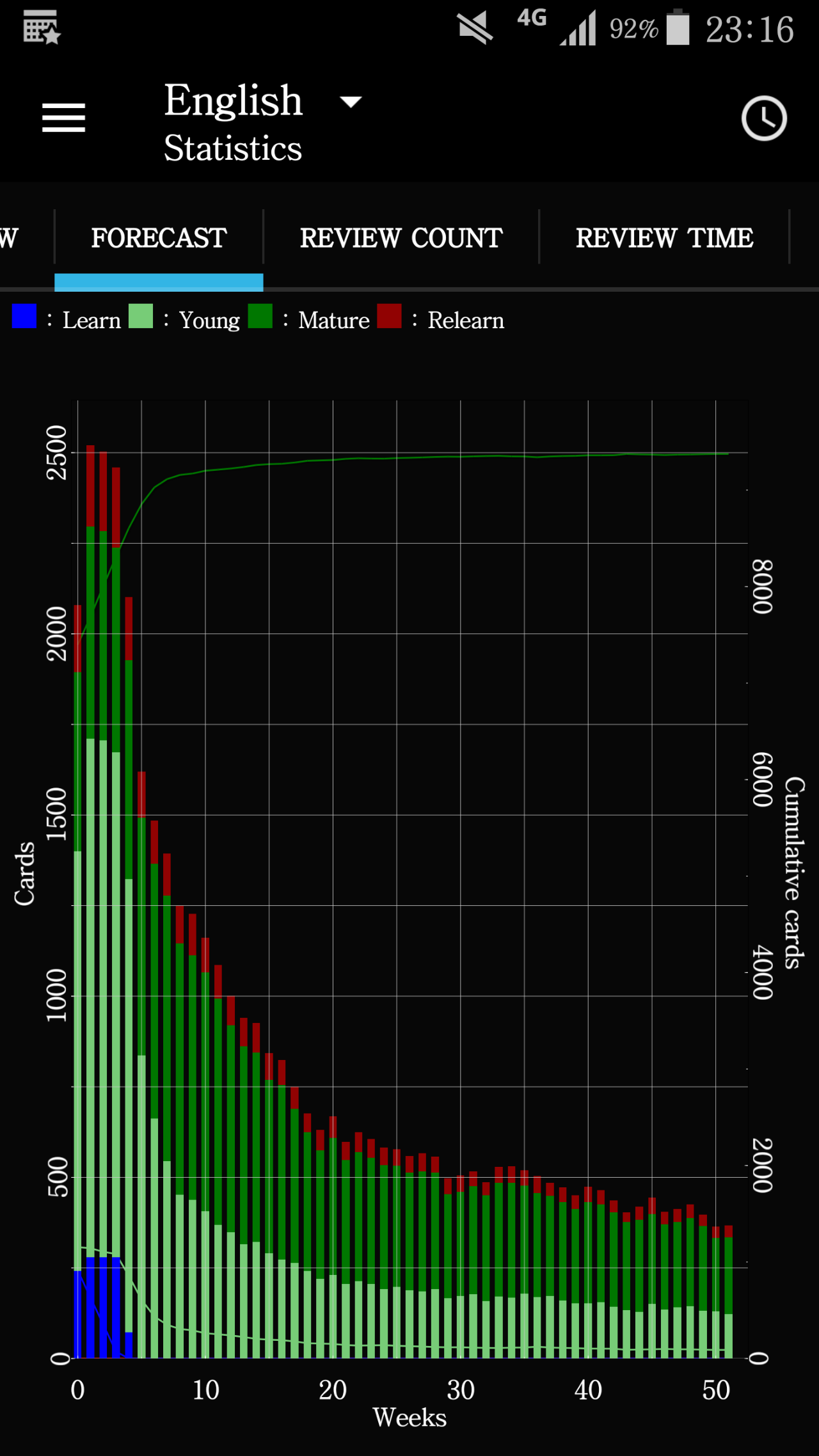 数据统计,既可以呈现今日、本月、本年乃至牌组寿命的数据和趋势。「Anki」 将卡片分为熟悉、有待熟悉、学习、重新学习和未学习。「Anki」统计不同卡片的数量并跟踪他们的错误次数和学习次数,并计算每天、每个时间段的正确率。通过这些数据,手机版的「Anki」有高级统计功能,可以预测我们未来的学习进度。