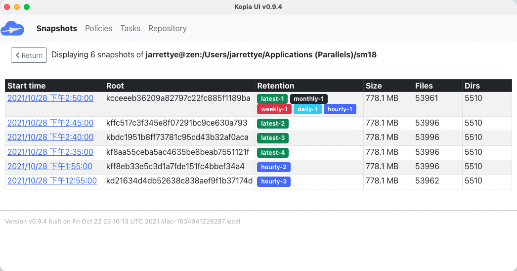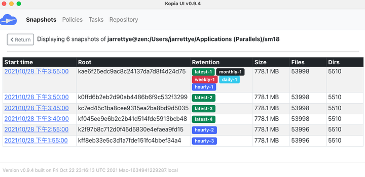我们已经完成了每 5 分钟备份一次的设置。Kopia 会保留最新的 4 份备份,也就是 5 分钟前、10 分钟前、15 分钟前、20分钟前。还有最近 3 小时,1 小时前、2 小时前、3 小时前。还有 1 天前、2 天前和一周前。有这么多兜底,妈妈再也不怕我 SuperMemo 崩溃啦!