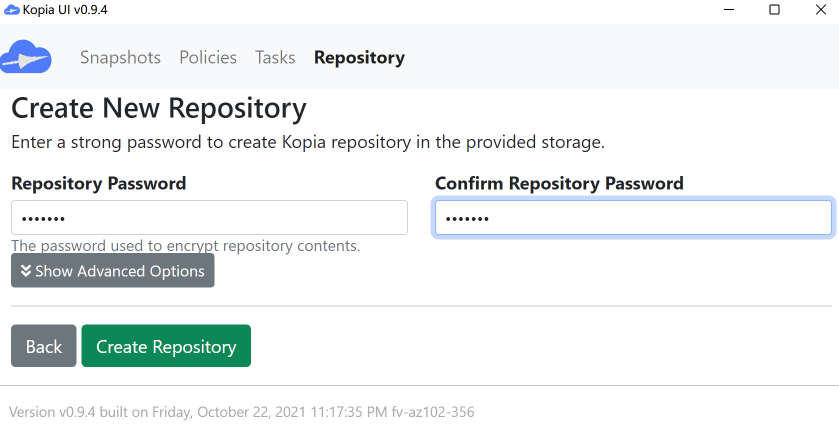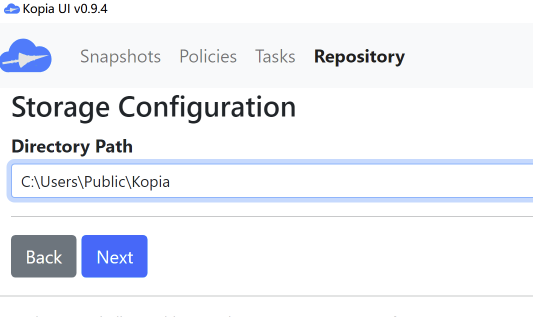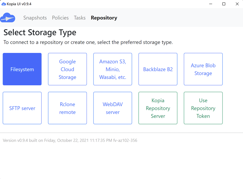 打开 Kopia 并点击 Filesystem,我们这次就做本地备份。