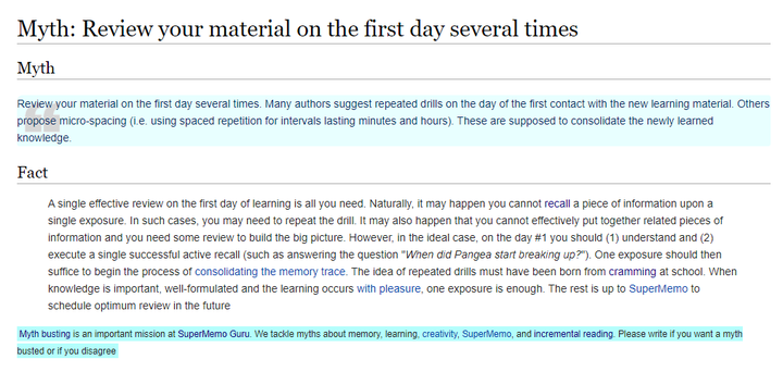 您只需要在学习的第一天进行一次有效的复习就行了。自然地,您可能一次接触就回忆不起一条信息。在这种情况下,您可能需要重复演练。也可能发生的情况是,您不能有效地将相关的信息组合在一起,您需要一些复习来构建全局。然而,在理想的情况下,在第一天,您应该(1)理解并(2)执行一次成功的主动回忆(例如回答「盘古大陆什么时候开始分裂的?」)。然后,一次接触应该足以开始巩固记忆痕迹的过程。反复练习的想法一定是从学校的死记硬背[1]中产生的。当知识很重要,组织得很好,学习是愉快[2]‘的时候,一次接触就足够了。 其余的由 SuperMemo 决定,以便在将来安排最佳复习。