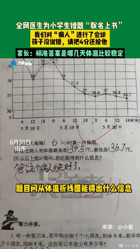 6月30日,山东。全网医生为小学生错题“联名上书”,我们对“病人”进行了会诊,“孩子没说错,请把这4分还给他。”