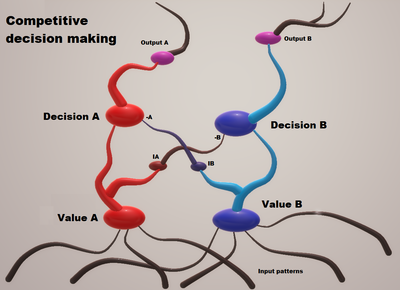 图:竞争决策中的神经元反馈环路。竞争决策中的神经元反馈回路。输入模式决定输入值(如由知识估值网络[1]计算)。抑制性神经元 IA 和 IB 减少竞争性决策神经元(决策 A或决策 B)的发射机会。先前决策的历史将决定突触的稳定,这将有利于过去带来更高回报的决策。另见:网络战争,竞争反馈环路在二元决策的神经元水平,在学校的学习内驱力。