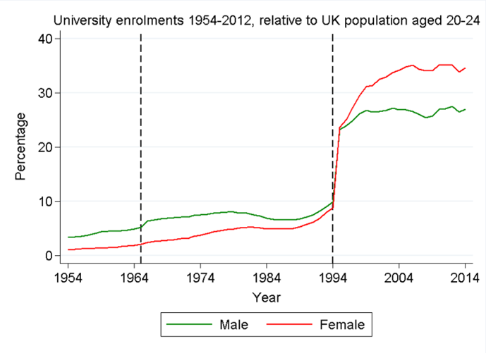 如果我的这一解释成立,那么在其他不具备这些特定因素的国家,大学入学率的增长应该不会如此迅速。虽然我没有全面的跨国数据,但以下是我所能找到的信息:
