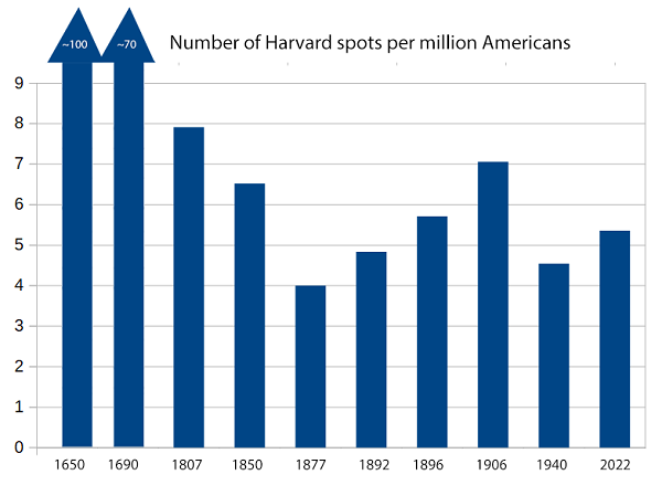 我想进一步指出,哈佛大学一直在增建宿舍、增聘教授,因此今天每个美国人拥有的哈佛名额,与十年前、二十年前,乃至追溯到 19 世纪都保持不变:
