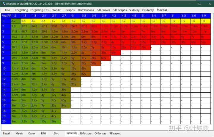 SuperMemo 的算法通过对我个人复习情况的拟合,计算出了不同难度、不同复习次数下对应的最佳复习间隔。可以看到第一个间隔已经有 8 天左右,而如果我的卡片做得非常烂,那么这个间隔可能就只有 1 天。