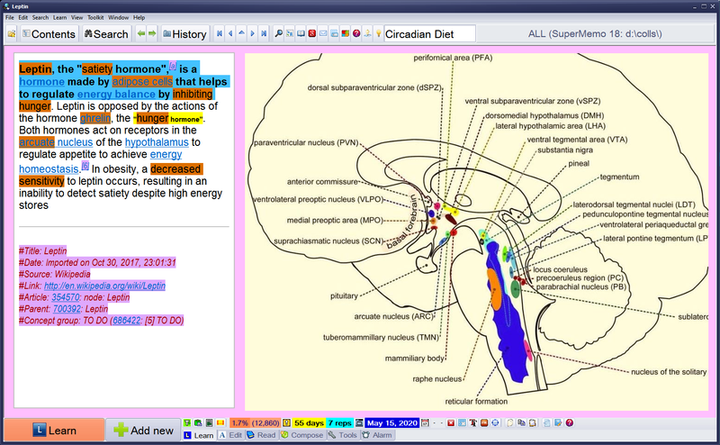 图:SuperMemo 中渐进阅读过程的一个典型快照。在学习瘦蛋白的过程中,学生摘抄了文本的重要部分(蓝色),并标记了关键词,这些关键词将被用来形成问题,以加强记忆(深橙色)。这些问题将按照间隔重复的时间表进行复习。请看这个视频例子的解释。大脑图片取自这里