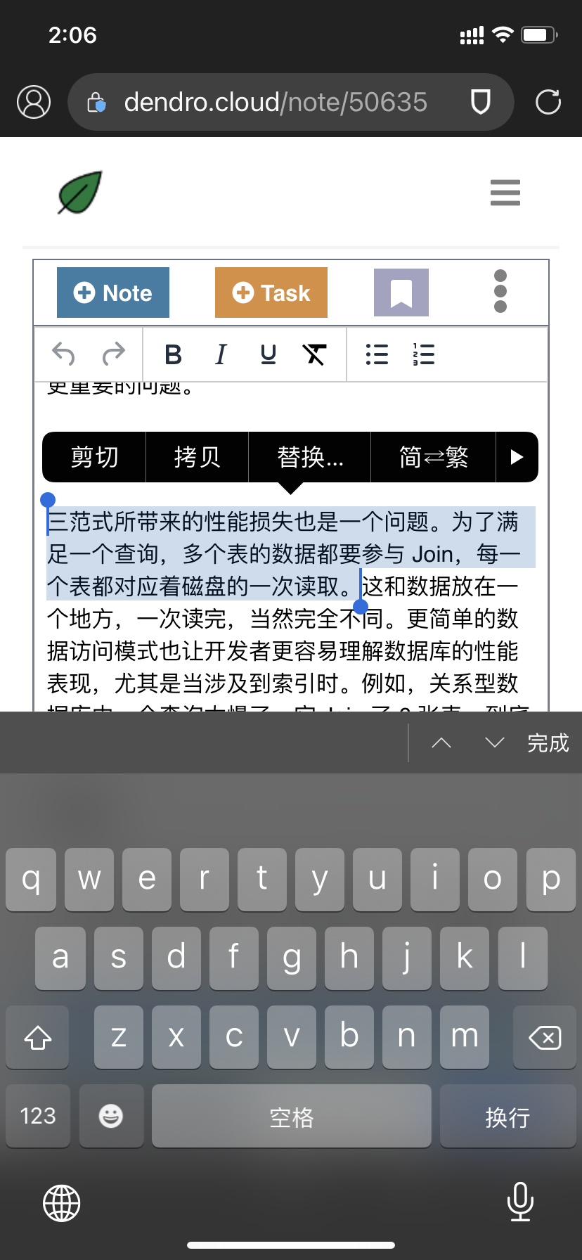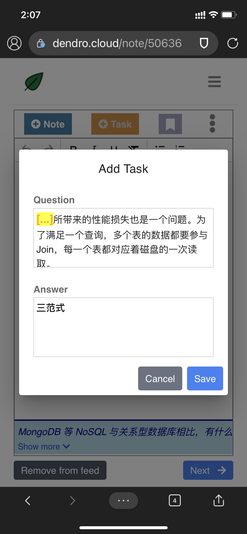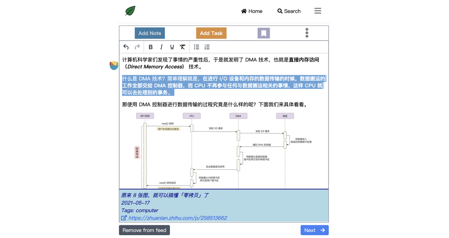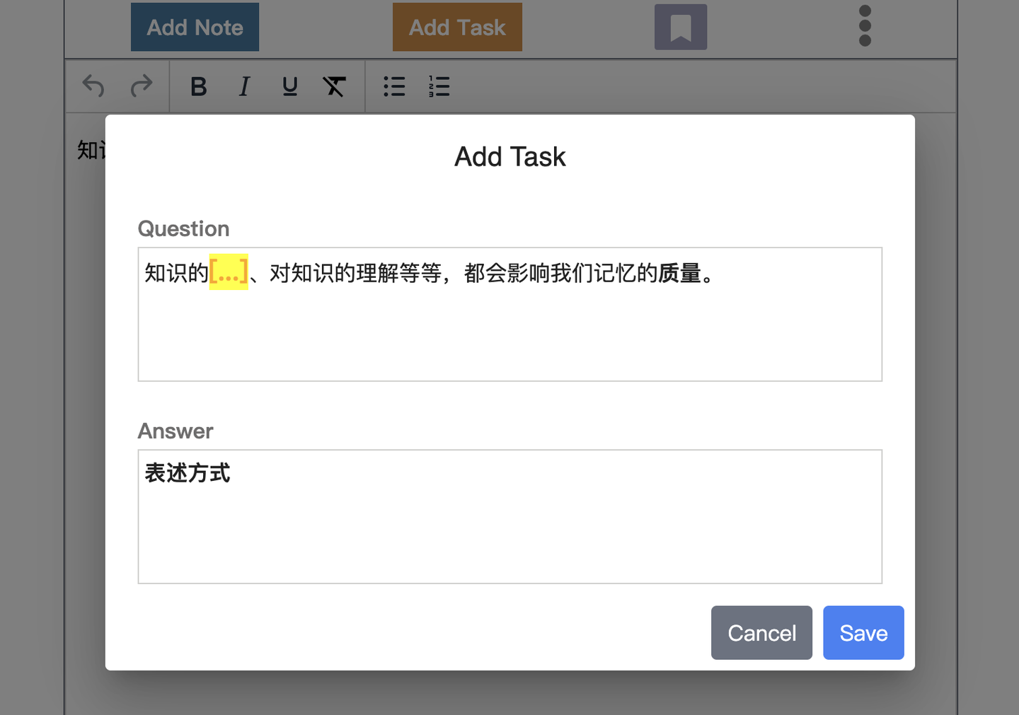 可用来阅读的卡片,Add Note 就是摘抄,可以生成更小片段的摘抄卡片,Add Task 就是挖空,可以生成问答卡片,书签则是用来标记上一次阅读到文章的位置。
