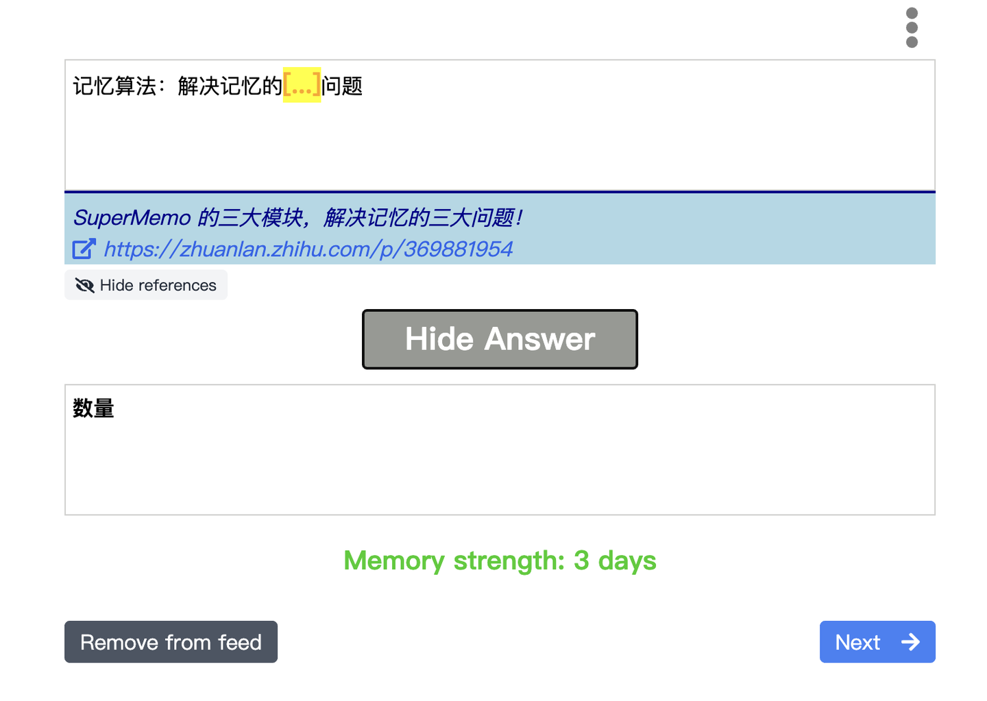 Remove from feed 就是暂停卡片,不再复习,next 就是下一张卡片: