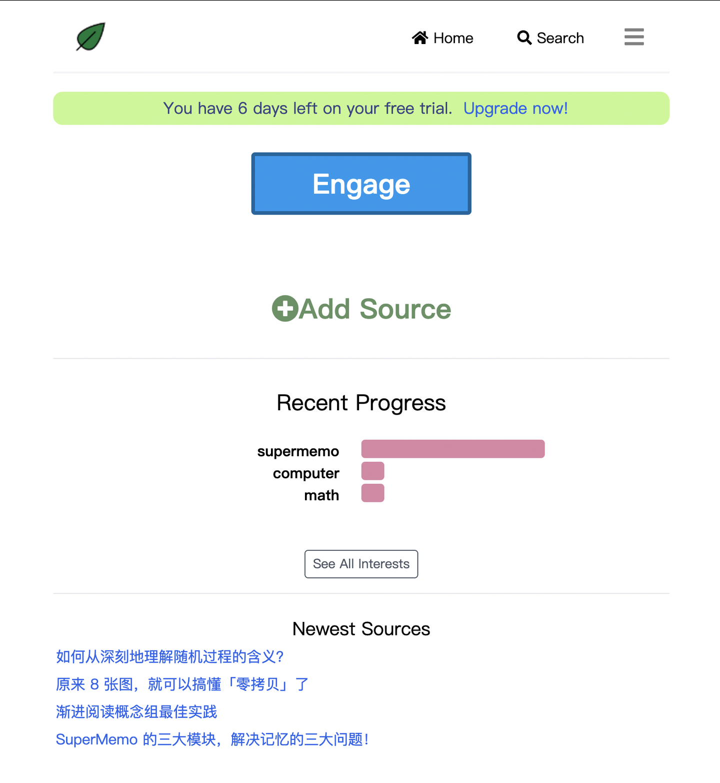 Engage 开始阅读+复习,Add Source 就是添加新的阅读材料: