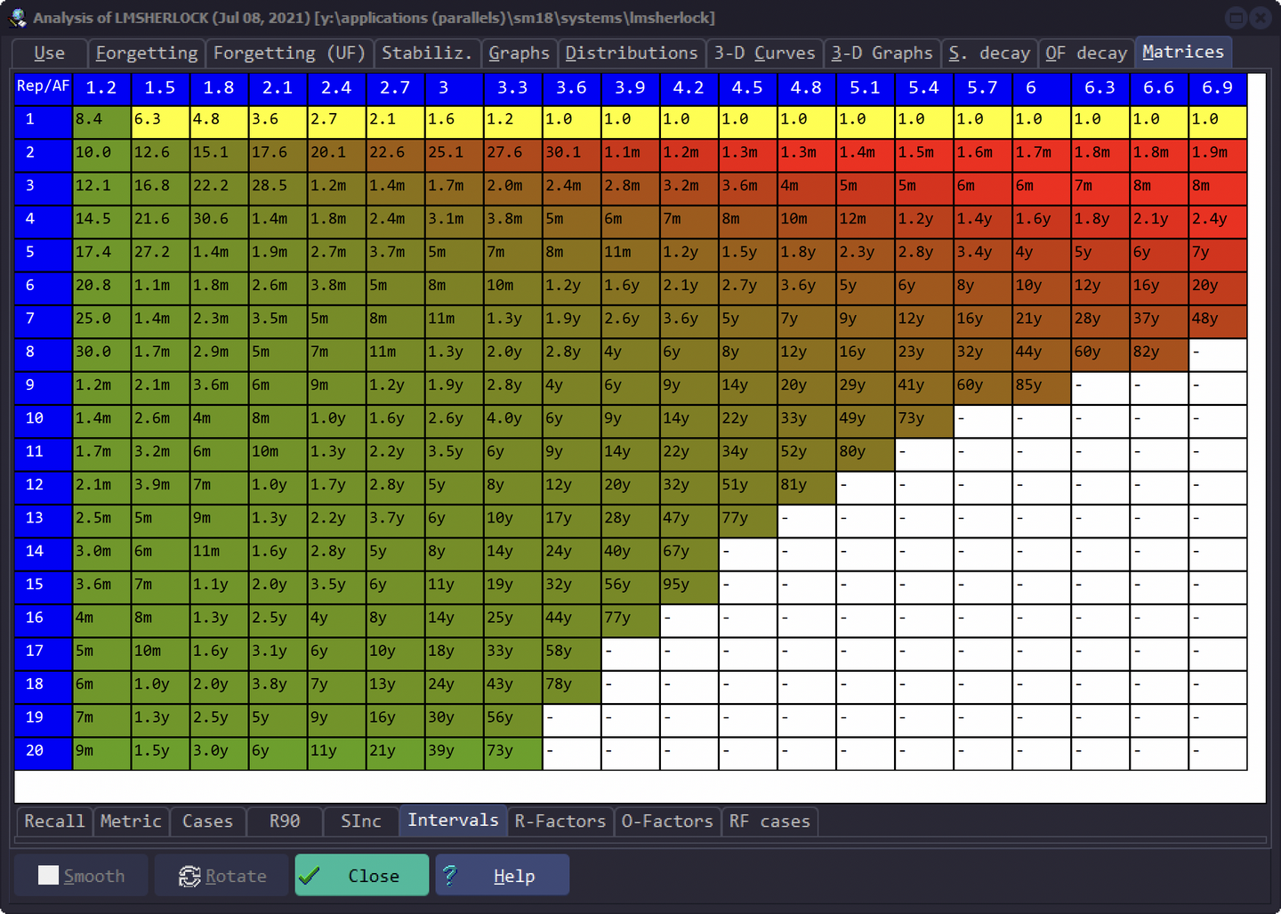 本矩阵是由 SM-15 算法按照用户复习数据拟合出的间隔矩阵,横索引代表卡片难度,越大越简单,纵索引表示连续记住次数。