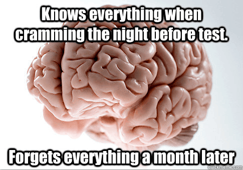 当然,学生们选择的正是后一种策略(死记硬背)。他们在考试前一晚临时抱佛脚,一个月后就什么都记不起来了。那么为什么要这么做呢?(我自己也不幸置身其中) 为什么间隔重复如此不受欢迎,甚至对于稍有尝试的人也是如此?[11]