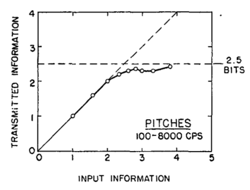 例如这里 Miller 给出的一张图 (1956, p. 83), 使用了 Pollack (1952, 1953) 关于人类对音高绝对判断的实验数据,并用信息论的方法进行了重构。