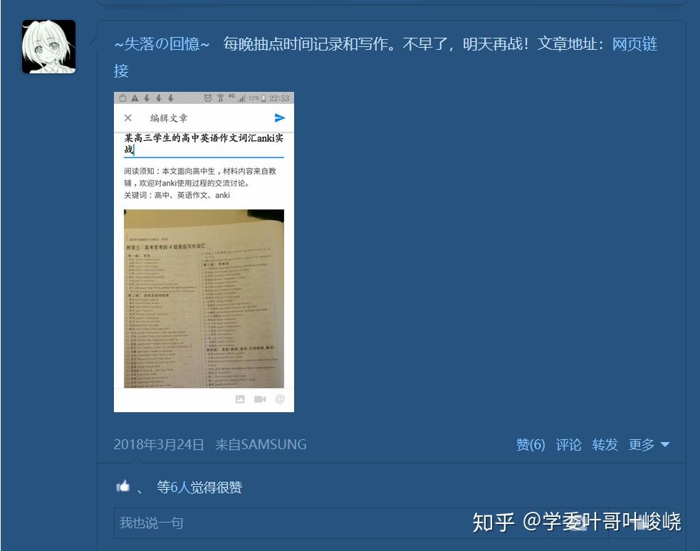 然后,我便一边用 Anki 准备高考,一边写文章推广 Anki 。那时我学习的一大动力便是先让自己强大,证明 Anki 学习法的优越性,再去说服别人。我的所作所为都为了我的意义服务。