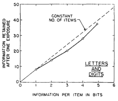 在这个描述 Pollack(1953)数据的图中,信道容量随着每组块比特量的增加而几近线性扩展(Miller, 1956, p.92)。