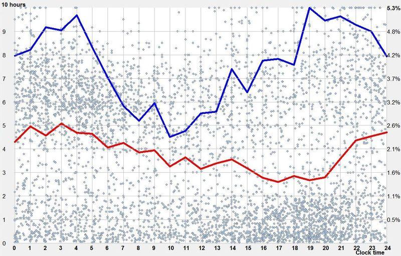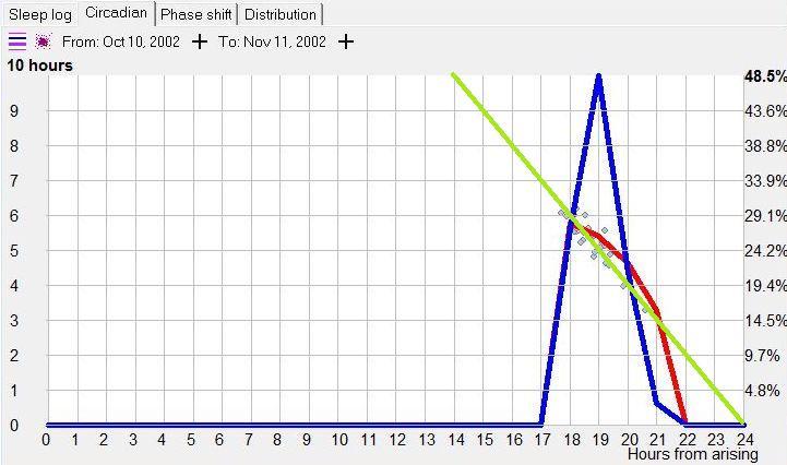 红线表示睡眠的平均时长。这条线粗略地表示了维持睡眠的能力,即,最长的睡眠时间发生在主观而言的夜间。左侧纵轴为睡眠的平均长度。这张图表明,即使你能在日间入睡,也不能维持很长时间。在多数常规睡眠者的情况下,只有在醒后第 11 - 14 小时,睡眠时长才会增加。请注意,睡眠长度图在参考首选的睡入睡时间时有轻微的相位偏移,这是因为长睡眠大多需要稍提早入睡。