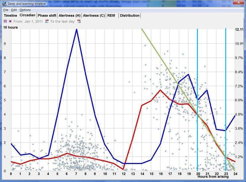 SleepChart 的睡眠时间线需要手动记录。记录时,先点击区块的开始(睡眠开始),然后再点击区块的末尾(睡眠结束)。你也可以先点击区块的末尾。不允许超过 22 小时睡眠块。睡眠块不能与其他时间线重叠(你不能边用 SuperMemo 学习,边睡觉)。如果你在单独的免费版 SleepChart 程序中收集了睡眠数据,你可以使用 File : Import : SleepChart file 迁移 SleepChart 数据至 SuperMemo(也可以导入电子表格)。同时,你可以用 File : Verify : Block overlaps 防止区块重叠。防止区块重叠是在 SuperMemo 中使用 SleepChart 的一个重要优势。相对于独立的 SleepChart 来说,后者很容易在录入数据时掉链子(例如一个月后才注意到缺失了一天的数据)。你可以标记强行延迟的睡眠区块,也可以标记因闹钟或其他因素而缩短的区块。请注意,如果你不人为地调节睡眠(例如用闹钟、安眠药等),你可以得到最好的分析结果。应用模型不会完全考虑到人工干预。最后,且十分重要的是,自然睡眠是你在学习中应该追求的目标,也是追求健康和幸福的最大来源。