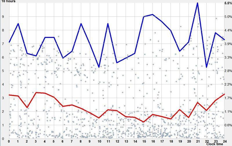 该图表现一个习惯午睡的人,显现了对 19 小时清醒时间的偏好。与前面的图表相比,因为红线和绿线几乎是平行的,因此垂直的水蓝色线划定的稳定睡眠-清醒周期区域要宽阔得多。这意味着,如果睡眠在醒来后的第 20 个小时后开始,夜间睡眠将会缩短,以适应 24 小时周期。自然,即使延迟睡眠不会导致相位偏移,但由于阶段压缩,这会导致睡眠质量下降,从而致使睡眠不足。如果在第 20 小时前睡觉,可能会导致相位提前。尽管睡眠自由运作,但最长的平均睡眠时长(大约在第 16 个小时入睡)甚至没有 6 个小时。这说明,在自由运作的睡眠中,睡眠过度不是大问题。在图中,最佳的午睡时间在第 7 小时,而且是虔诚地执行(超过 14% 概率的睡眠事件是「按点」执行的)。