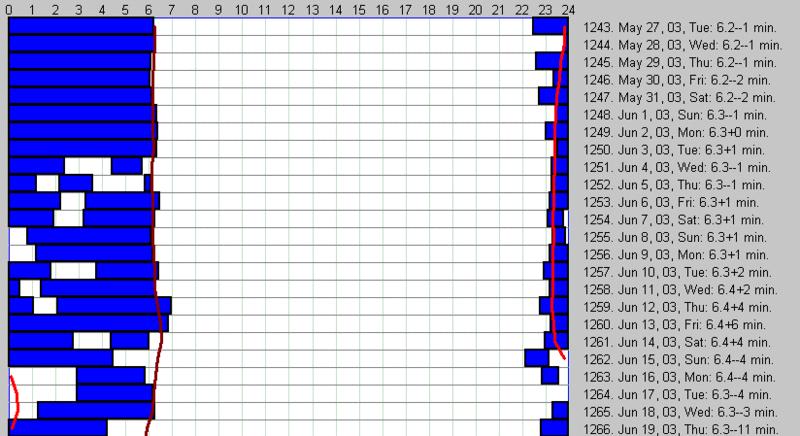 在众多人口中,睡眠的习惯不计其数。这些差异之间又一个重要的生物原因。科学家们用「时间型」这个属于来区分不同个体的睡眠的入睡时间和持续时间。一个人的时间型可能是短睡者,另一个人的时间型可能是猫头鹰。然而,有些时间型会被诊断为睡眠相位障碍。尽管看起来种类繁多,但一组小的基本变量应该能让你相当容易地弄清自己的基本时间型。你的时间型可能决定你是否适合某些职业。幸运的是,在选择专业或工作之前,不需要确定你的时间型。许多人本能地倾向于符合其自然睡眠习惯的活动和职业。医生或消防员需要忍受轮班工作和中断的睡眠。挤奶工早起,而健身房或迪斯科舞厅老板需要熬夜,而作家可以是任何时间型的人,因为可以根据睡眠模式来调整自己的写作时间。为了说明个人的睡眠模式,我使用了一个叫做 SleepChart 的免费软件,你可以在这里下载这个软件来直观地描绘你自己的睡眠(Wozniak 等,2003[1])。如果你收集了几个月的数据,我将非常乐意收到你的数据文件,用于分析和未来的研究。您可以发送 SleepChart 数据,只需在程序中点击一下即可。