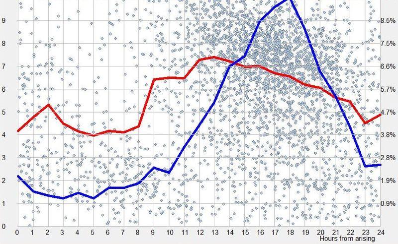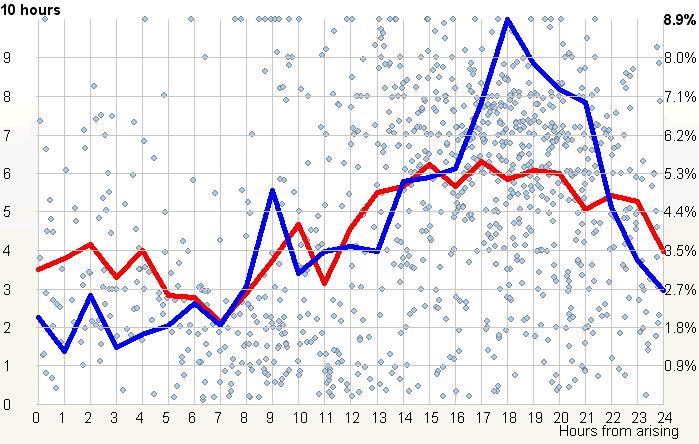 有些人在白天会小睡。其他人则不这样做。对于午睡者,蓝线也应该指向中午最大的注意力下降。短暂的午睡时间实际上可能是一个良好的午睡时机的标志,只要参照蓝线,午睡时间不要太早(参见:最佳午睡时间)。不打盹的人也会在第 7 个小时左右经历睡意高峰,尽管他们的蓝线不会显示出突出的隆起。