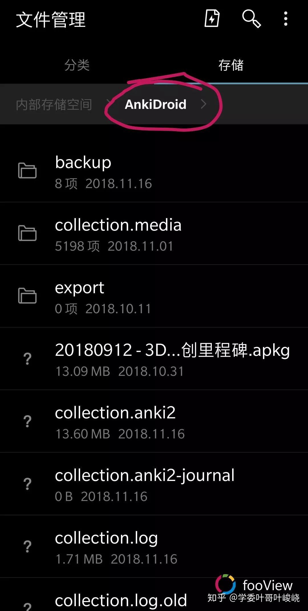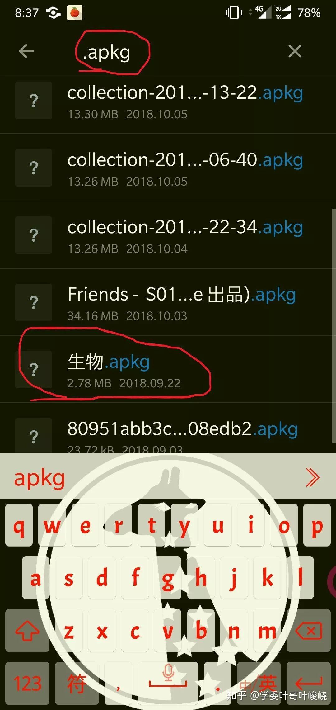 「没关系,你只需要在文件管理里面搜索『.apkg』即可,我给你演示一下」