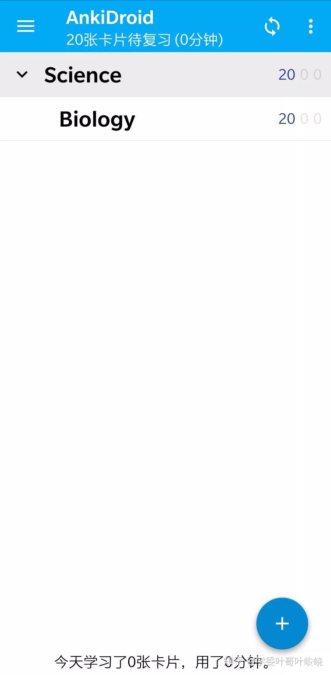 「确实不止 20 张,只不过 Anki 默认你一天新学 20 张,看到那个 20 是蓝色的吧?这就是需要学习的卡片。我再给你看看我的主页面」