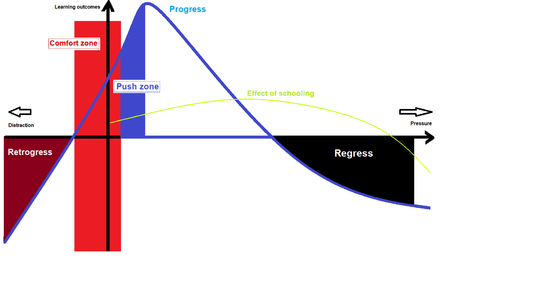图:最佳推动区[23](蓝色)是可能提高学习成果的外部压力范围。如果压力的增加超过了推动区,学习效果就会下降。在某些时候,压力非但不会带来更多的学习,反而会导致更少的学习(黑色的倒退区)。学校教育[24]通过习得性无助[18]导致对胁迫[25]的容忍度增加(绿色)。它也降低了学习成果,增加了所需的胁迫水平。注意胁迫功能与毒物兴奋效应功能的相似性。