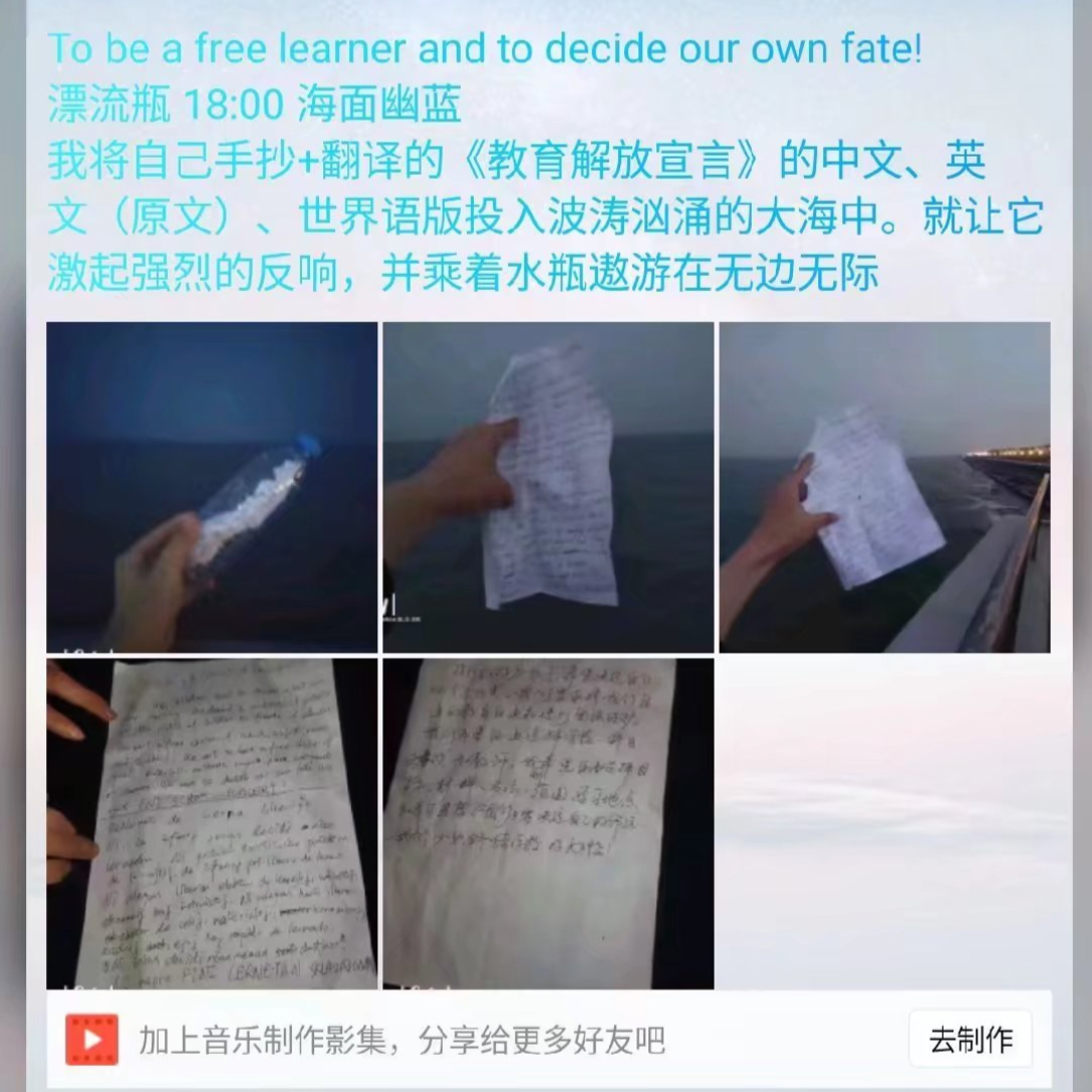 那一天,在这样的觉悟下——2021/9/29,成了我的「自由学习纪念日」(不过所有纪念日都是在 2022/5/11 之后追溯后设立的)—— 这一天,我决心优先为了个人成长,而不是学历,我要优先做一个好的自由学习者,而非好学生!这一天,我开始反思我 18 年的学习史,并下笔写《做一个生命中的重要决定》。在次日 2021/9/30,我便在海边用漂流瓶,自己将 1950s 便有的《教育解放宣言[8]》,亲手翻译成世界语和英语,并亲手写下,投进海洋的希望。