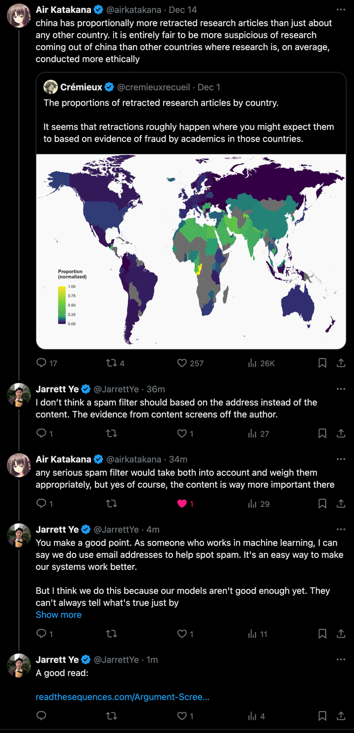 你说得很有道理。作为机器学习的从业者,我可以肯定地说,我们确实利用电子邮件地址来帮助识别垃圾邮件。这是一种让我们的系统更高效运作的简便方法。 但我认为我们这样做是因为我们的模型还不够好。它们不能仅凭词语就总是判断出什么是真实的。在一个理想的世界里,一个真实的陈述无论谁说出来都应该是真实的。这是人工智能领域更大问题的一部分。通常,更多的数据有助于我们的算法更好地工作。但大多数人并不希望应用程序收集大量关于他们的数据。这里涉及不同的重要因素——比如得到正确的答案、保护信息隐私以及对每个人都公平。 这就是为什么我们正在探索新的方法,比如联邦学习。它试图平衡这些不同的需求。我认为最终我们应该根据言论本身来判断事物,而不是看是谁说的。但就目前而言,由于我们的技术尚未完美,有时也不得不借助其他信息。