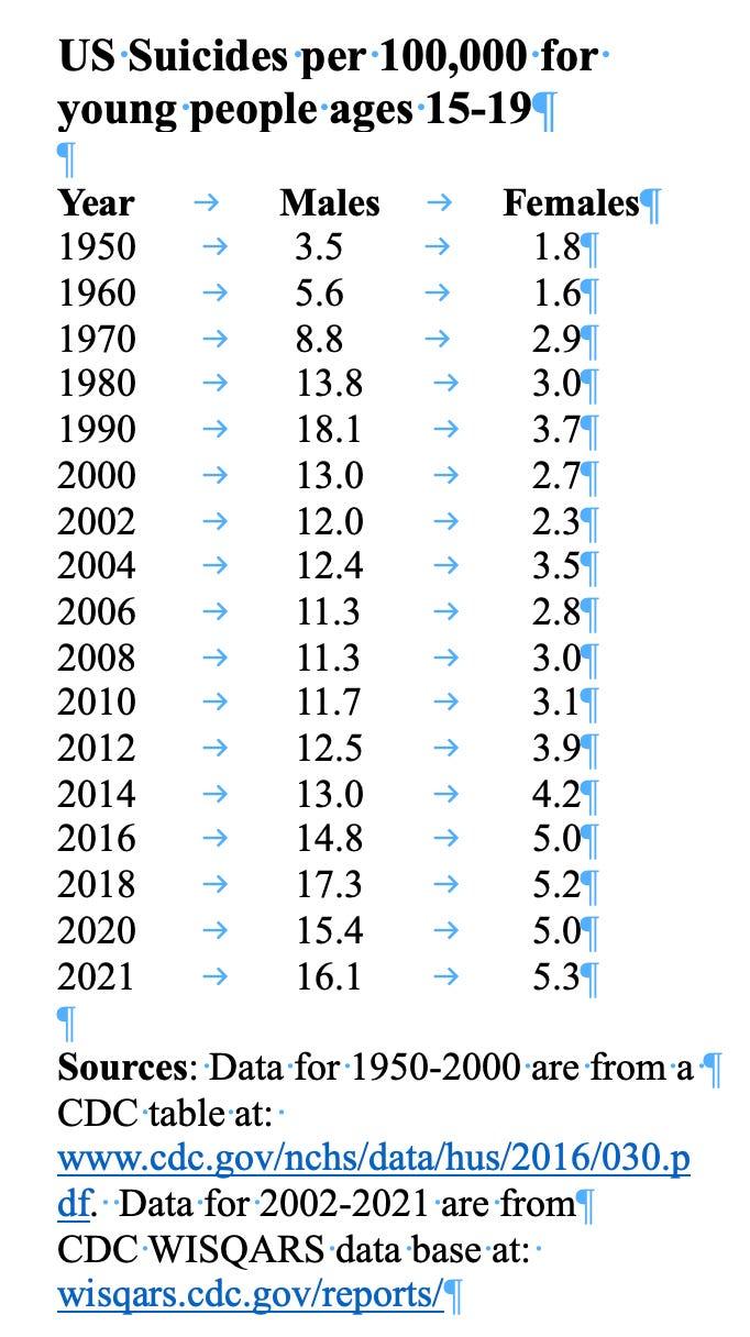 值得关注的第四个显著变化是,2010 年至 2018 年期间,男生自杀率再次急剧攀升。事实上,这一时期的上升速率与 1970 年至 1990 年间相当,尽管未达到 1990 年的峰值。同期,女生自杀率也呈上升趋势,增速超过了以往任何时期,但仍远低于男生。[顺便一提,2020 年自杀率的下降,很可能源于新冠疫情期间学校停课,导致青少年自杀人数明显减少,这一点已有充分记录。更多信息请参见此处。]
