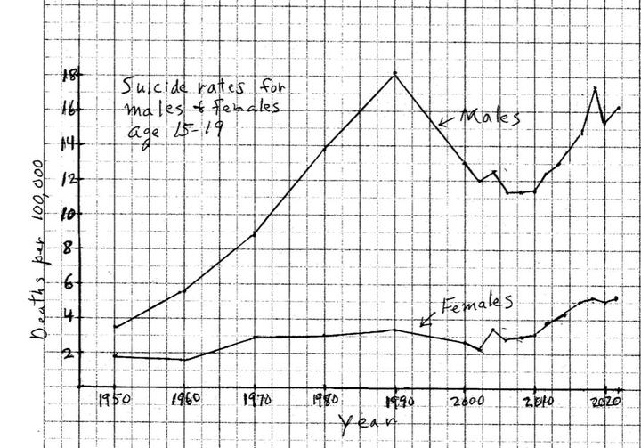 其次,令人震惊的是,在 1950 至 1990 年间,男生自杀率呈现出急剧的、近乎线性的增长。每 10 万人中的自杀率猛增了 5 倍多,从 3.5 飙升至 18.1。相比之下,同期女生的自杀率仅增长了一倍多一点,从 1.8 升至 3.7。