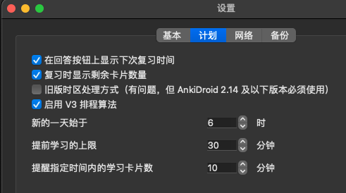 Anki -> 首选项 -> 计划 -> 启用 V3 排程算法