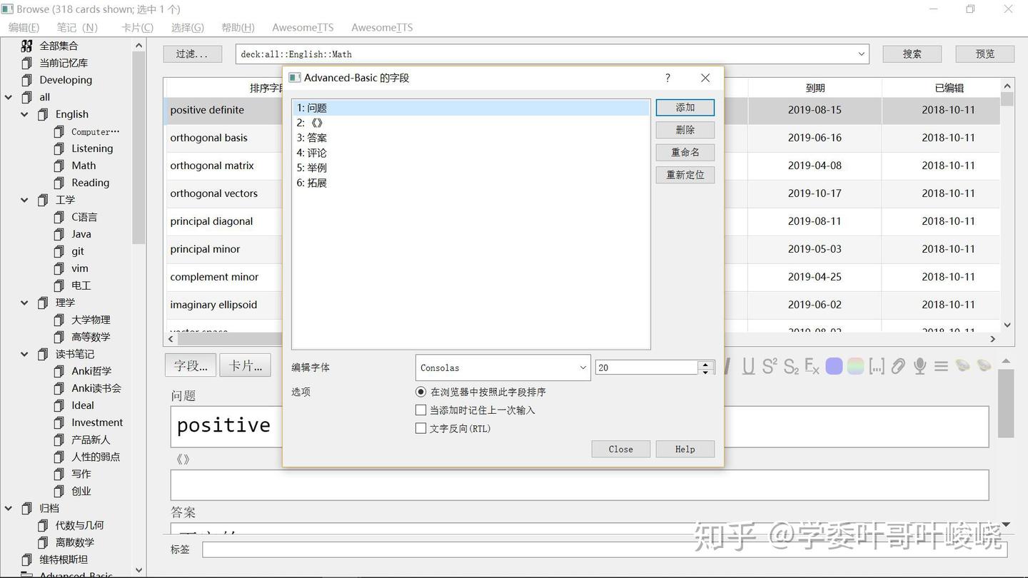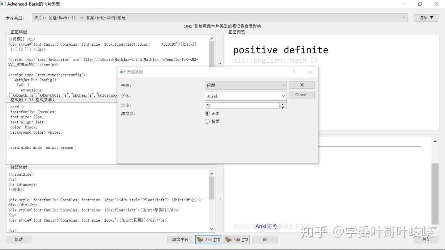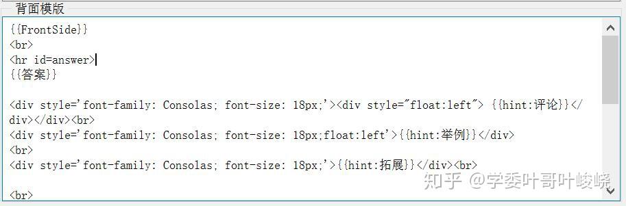 说的明白点,就是 Anki 的每张卡片其实都是一个网页,然后这一串代码就是 html 的标记,想要设计复杂的卡片模板,建议学习一下 html 和 css,如果只是想添加一下普普通通的字段的话,Anki 提供了简单的添加字段到正面或背面的方法,只要点击最下方的添加字段