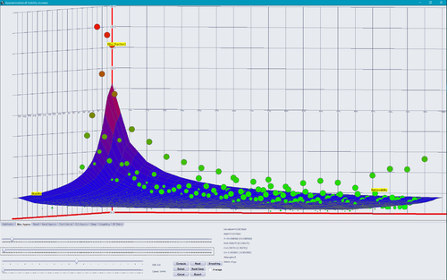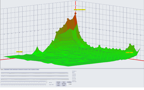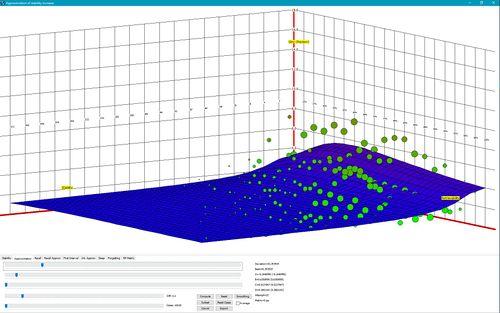 图:由 SM-17 算法近似的期望稳定性。该函数接受三个参数:(1)复习时的稳定性,以天为单位(在左侧),(2)复习时的可提取性(在右侧),和(3)记忆复杂性,以条目难度表示(标签为 Diff 的滑块目前设置在 0.1 处,即简单条目)。在图中,巩固(期望稳定性增长)的峰值为 5(纵轴)。不同于实际数据,该近似被设置为永不小于 1.0。这意味着该近似函数永远不会让复习时的稳定性下降。10,130 次简单条目的重复被用于生成该图(Diff=0.1)。其中一个数据点展示了间隔达到 14 年的一组重复样本(稳定性为 5172)。