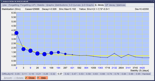 图:稳定化衰减是记忆稳定化随着记忆稳定性提高而下降。取自 SuperMemo 的图片展示了稳定性对难度估计为 0.37 的条目的稳定化影响。绘制该图表使用了 25,686 条复习记录。稳定化的衰减率为 -0.529。稳定性可能的最大增长(SIncMax)是 3.102(当稳定性 =1 时)。蓝色圆圈表示数据点(S:SInc),圆圈越大,复习记录的样本量越大。黄线是幂函数拟合,公式为:SInc=(3.102-1)*S-0.529+1。该拟合的偏差为 0.4235。