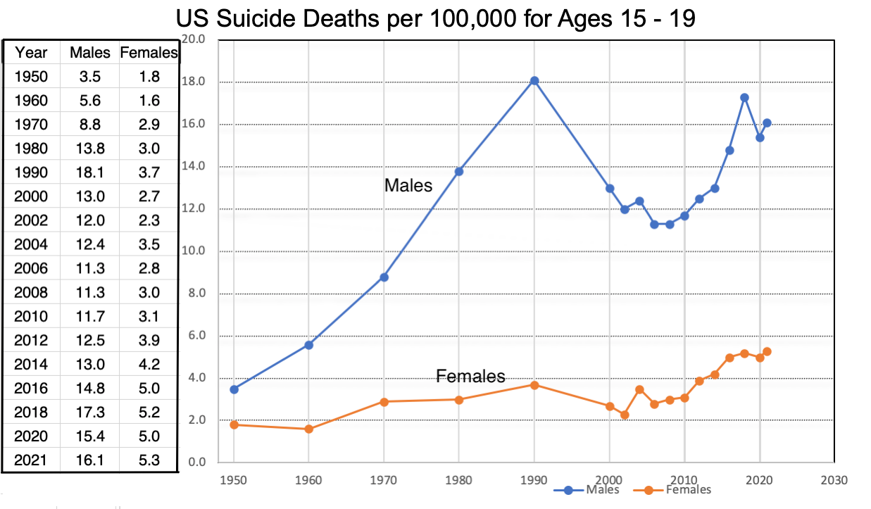 在上一封信 D1[1] 中,我用表格和手绘图分别展示了 1950 至 2021 年美国青少年自杀率(区分男女)的变化。此次,我要由衷感谢国家玩耍研究所执行董事、我的同事 Tony Christopher,在他的帮助下,我得以呈现更加精美的图表。Tony 具备我所不具备的专业技能,而且非常乐于助人,对此我深表感激。