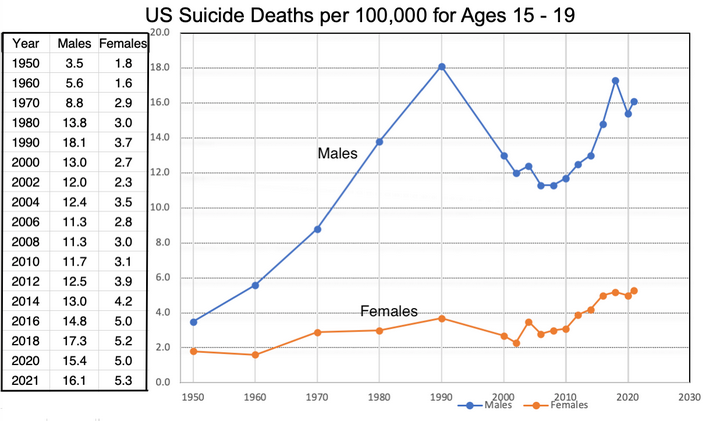 我的请求引发了许多富有见地的评论,提出了相当合理的建议。在这篇文章中,我将结合这些观点,探讨关于第一个问题的理论,即 1950 年至 1990 年期间男孩自杀人数大幅上升(以及女孩自杀人数相对较小的增幅)的原因。至于第二个和第三个问题的相关想法,我将在后续文章中讨论。