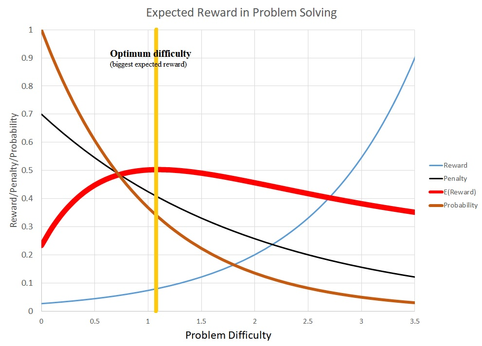 图:问题估值中的金发姑娘效应:较难的问题奖励较多,但被解决的可能性较小。这决定了我们要寻找最优难度。期望奖励会根据执行成本来评估。精通问题解决的人,善于找到能使奖励最大化的问题。孩子们很快就会对简单的游戏感到厌烦。他们也会放弃那些超出他们水平的游戏,并自然而然地选择那些奖励最大的游戏,而这种奖励正处于中等的难度范围。这样的机制也同样适用于儿童、成人或各种需要解决问题的动物