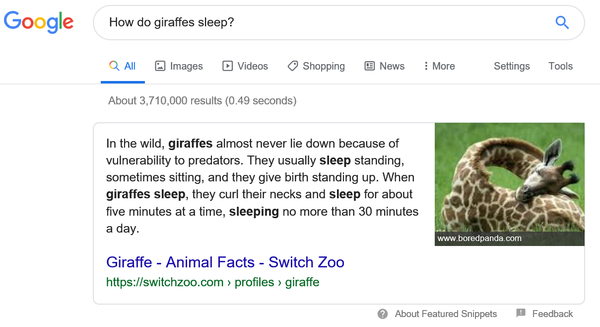 在 Papert 的文章发表 26 年后,当我问及长颈鹿的睡眠问题时,谷歌是这样告诉我的(搜索时间少于 500 毫秒,2019 年 9 月 3 日):