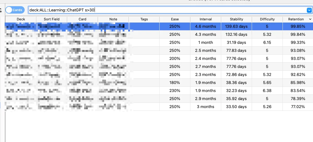 - 增加了卡片浏览器支持,现在可以在卡片浏览器中查看每张卡片的记忆状态,也可以通过特定语法搜索这些卡片 (但由于Anki框架原因,无法在筛选牌组搜索中使用)