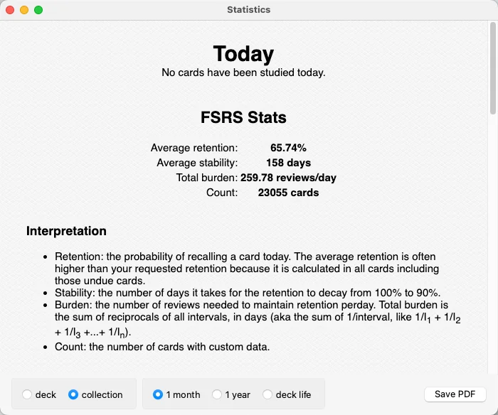 - 增加了 FSRS 统计面板,可以查看自己的 retention、stability 的统计信息。