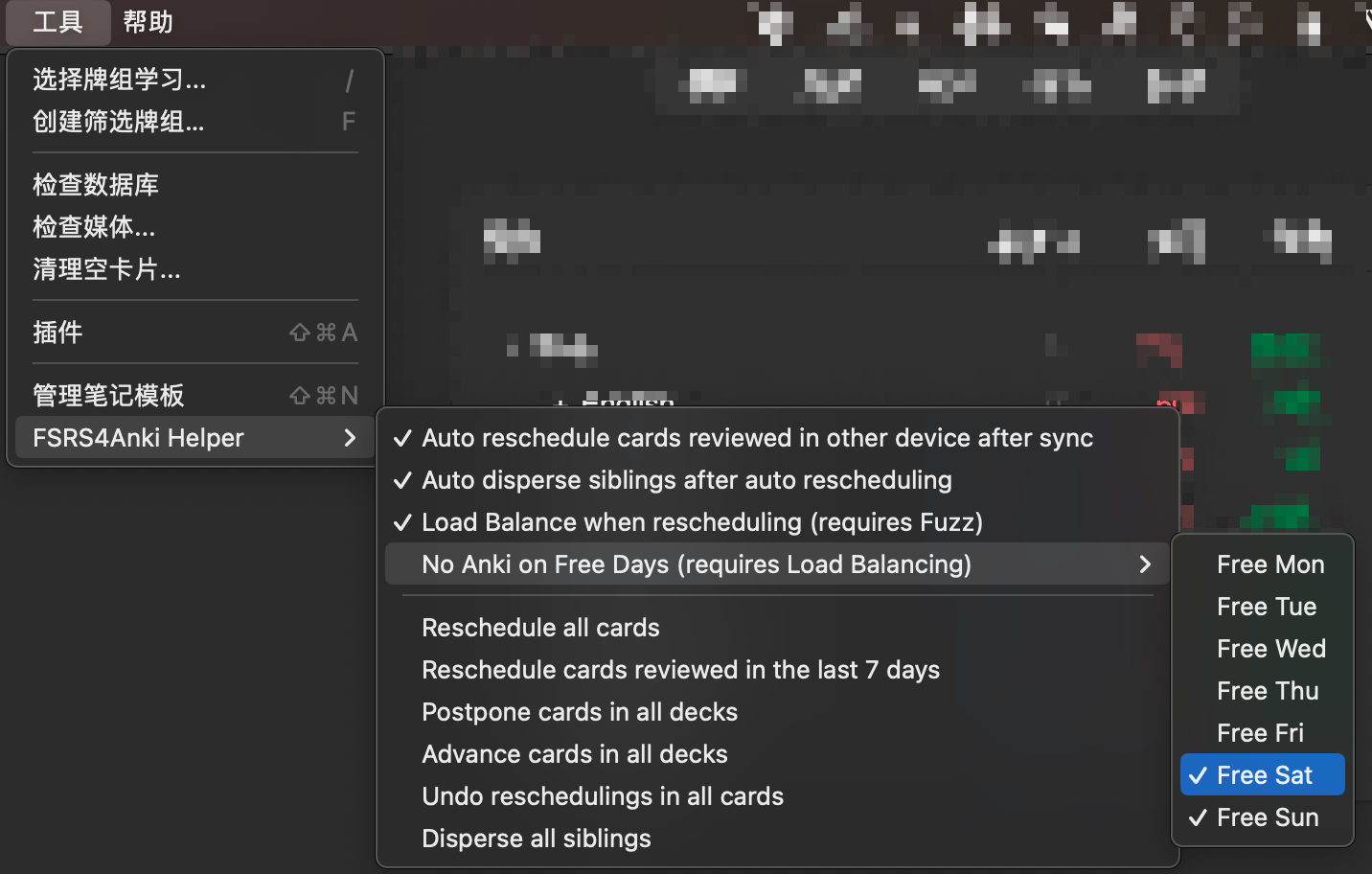 实际上可以选择在周一到周天任何几天进行放假。开启后,进行重新调度时,Helper 将尽可能避开你设定的日期安排复习。