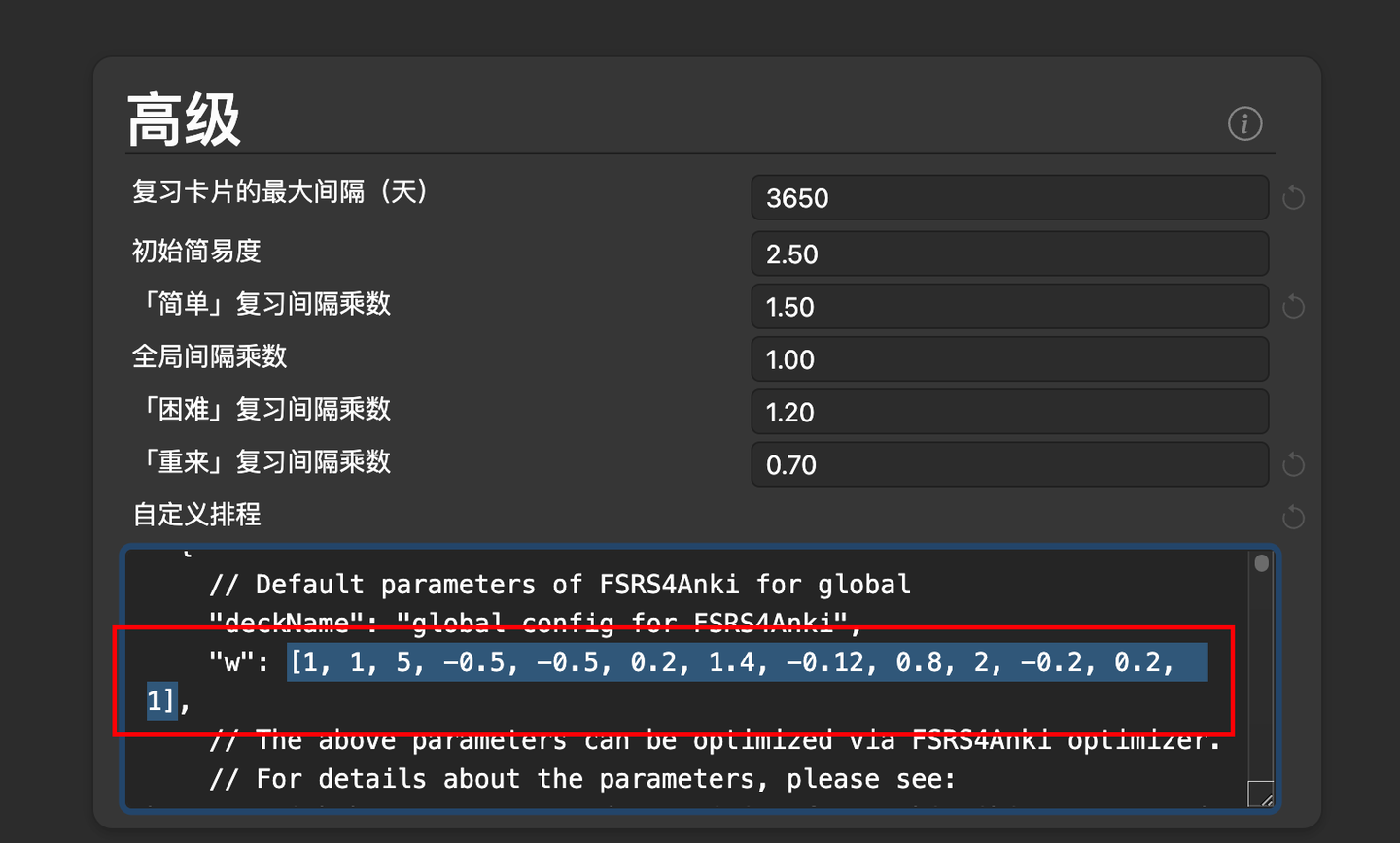 理论上你已经开始使用 FSRS4Anki 算法了。如果你不确定,可以将代码中的