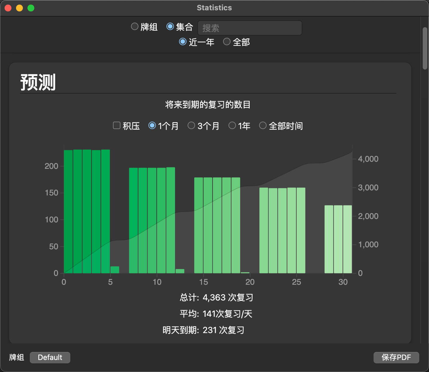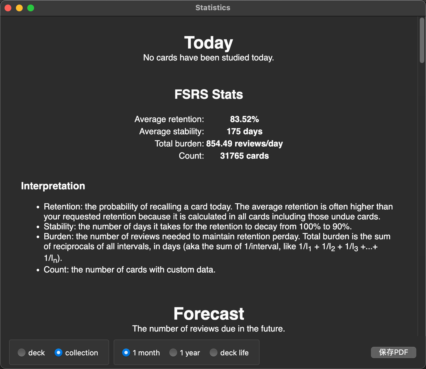 Average retention,即平均保留率,反映了你目前所有复习过的卡片还记得的百分比。