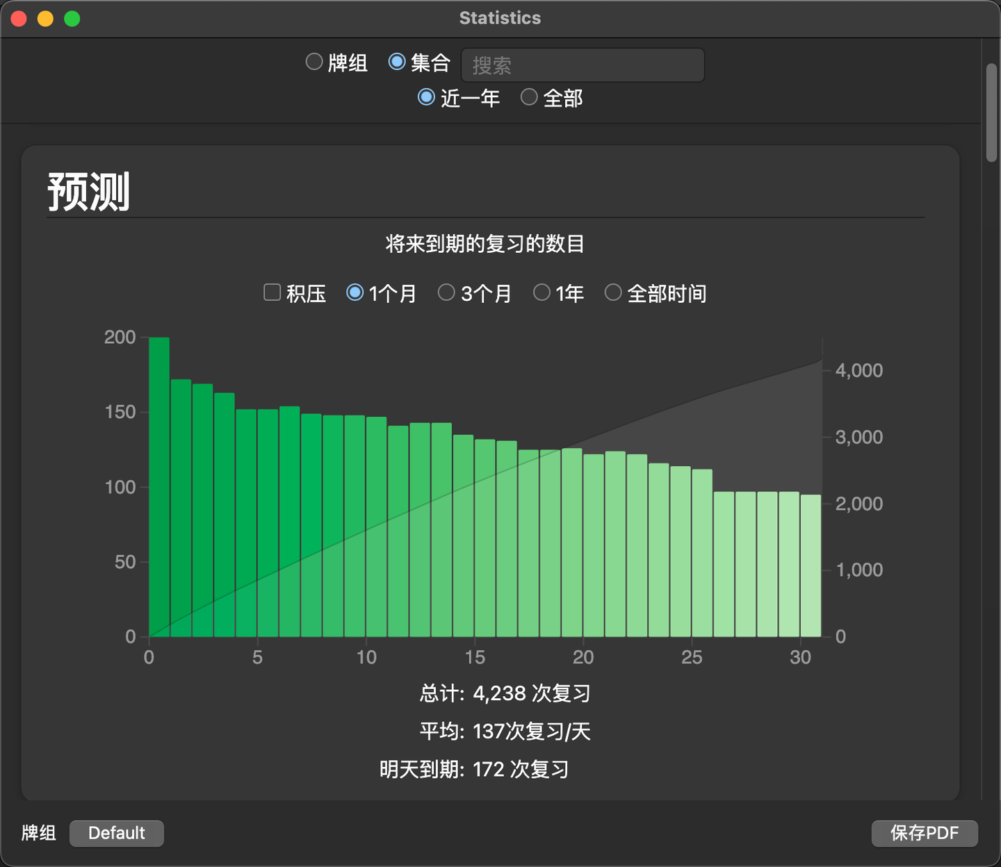 Average stability,即平均记忆稳定性,反映了你目前所有复习过的卡片的遗忘速率。稳定性越大,遗忘速率越慢。