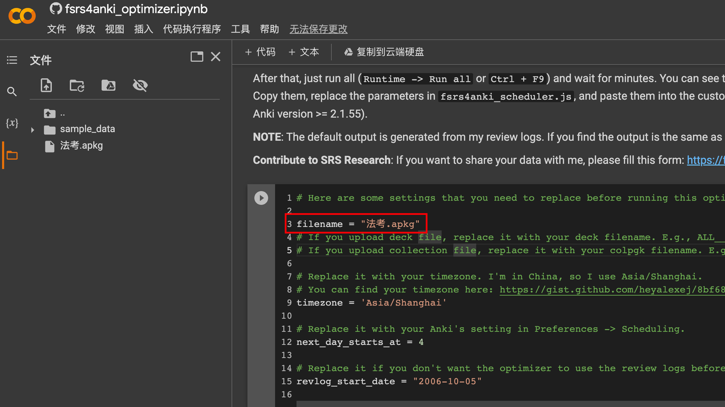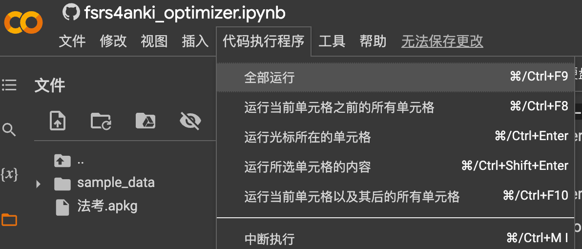 fsrs4anki/fsrs4anki_optimizer.ipynb at main · open-spaced-repetition/fsrs4anki打开 optimizer 的 notebook,点击 Open in Colab,即可在 Google Colab 上运行优化器,不需要自己配置代码运行环境,还可以白嫖 Google 的机器(需要注册 Google 账号):