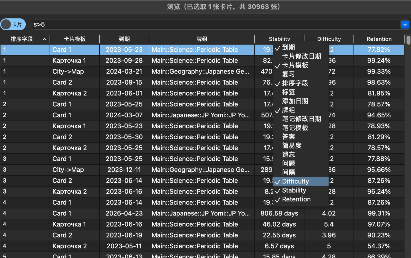 在卡片浏览器中,你可以右键表头,点击 Difficulty、Stability、Retention,让卡片浏览器显示卡片当前的记忆状态。
