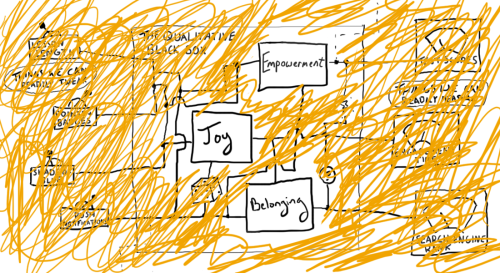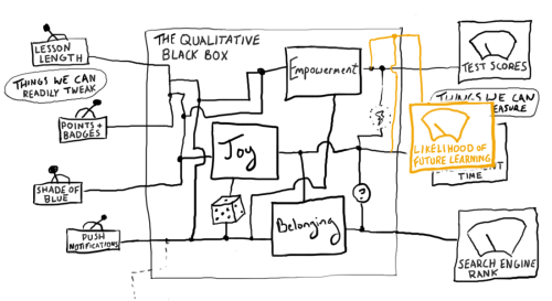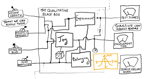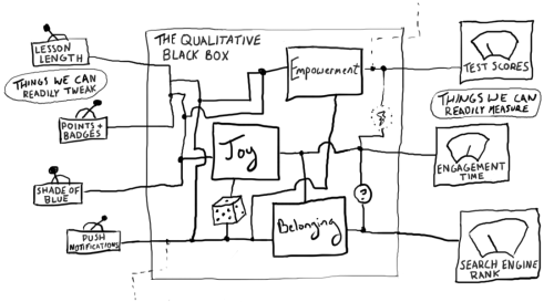 喜悦、归属感和赋权可能存在于这个图片中的「定性黑箱」里,但我们仍然可以为它们的产生提供解释。这些解释可能会涉及可测量的输入和输出。但如果我们坚持通过,比如说,参与时间和净推荐值来解释喜悦,我们将得到我们活该得到的喜悦。