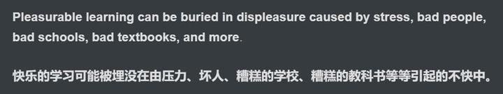 当我声称所有的学习都是令人愉快的时候,我听到了一种声音,像是“我不得不经历一场压力很大的考试,它给了我很多生活上的好知识”。这些声音混淆了良好学习的乐趣和使学习成为许多学生恐惧的因素的不快。这些可怕的因素包括糟糕的老师,严厉的家长,最后期限,压力,糟糕的睡眠,糟糕的教科书,过多的书册,等等。