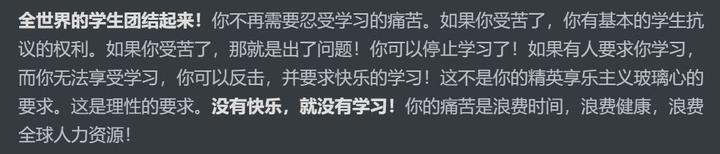 全世界的学生团结起来!你不再需要忍受学习的痛苦。如果你受苦了,你有基本的学生抗议的权利。如果你受苦了,那就是出了问题!你可以停止学习了!如果有人要求你学习,而你无法享受学习,你可以反击,并要求快乐的学习!这不是你的精英享乐主义玻璃心的要求。这是理性的要求。没有快乐,就没有学习!你的痛苦是浪费时间,浪费健康,浪费全球人力资源!