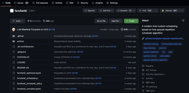 注:我并不是 FSRS 的开发者。我只是一个在 GitHub 上经常提交错误报告和功能请求的普通人。但我对 FSRS 非常了解,特别是 v4 版本的很多改动,都是我一手提议的。(校对:这人提了几十个 issue,累死我了)